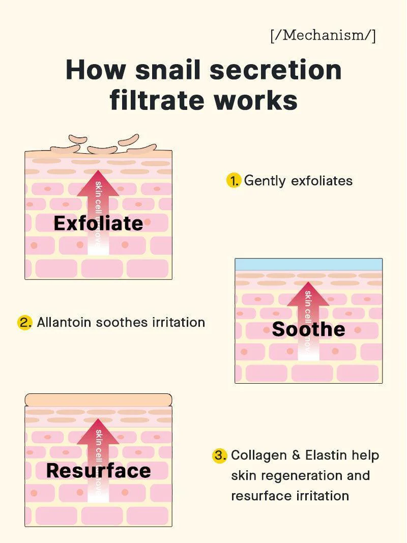 Πλούσιο σε αλλαντοΐνη, κολλαγόνο, ελαστίνη, γλυκολικό οξύ και φυσικά ένζυμα, το έκκριμα σαλιγκαριού βοηθά στην επανόρθωση του δέρματος, μειώνει τα σημάδια ακμής και διεγείρει την παραγωγή κολλαγόνου για πιο νεανική επιδερμίδα.