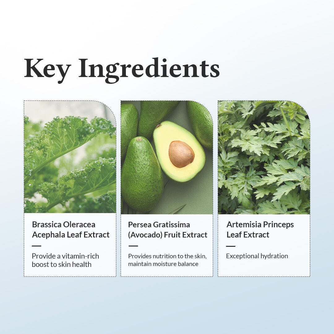 Paeonia Albiflora Flower Extract, Persea Gratissima (Avocado) Fruit Extract, Argania Spinosa Kernel Oil, Camellia Sinensis Seed Oil, Tocopherol (Vitamin E), Artemisia Princeps Leaf Extract, Brassica Oleracea Acephala Leaf Extract, Hyaluronic Acid Complex (7 types).