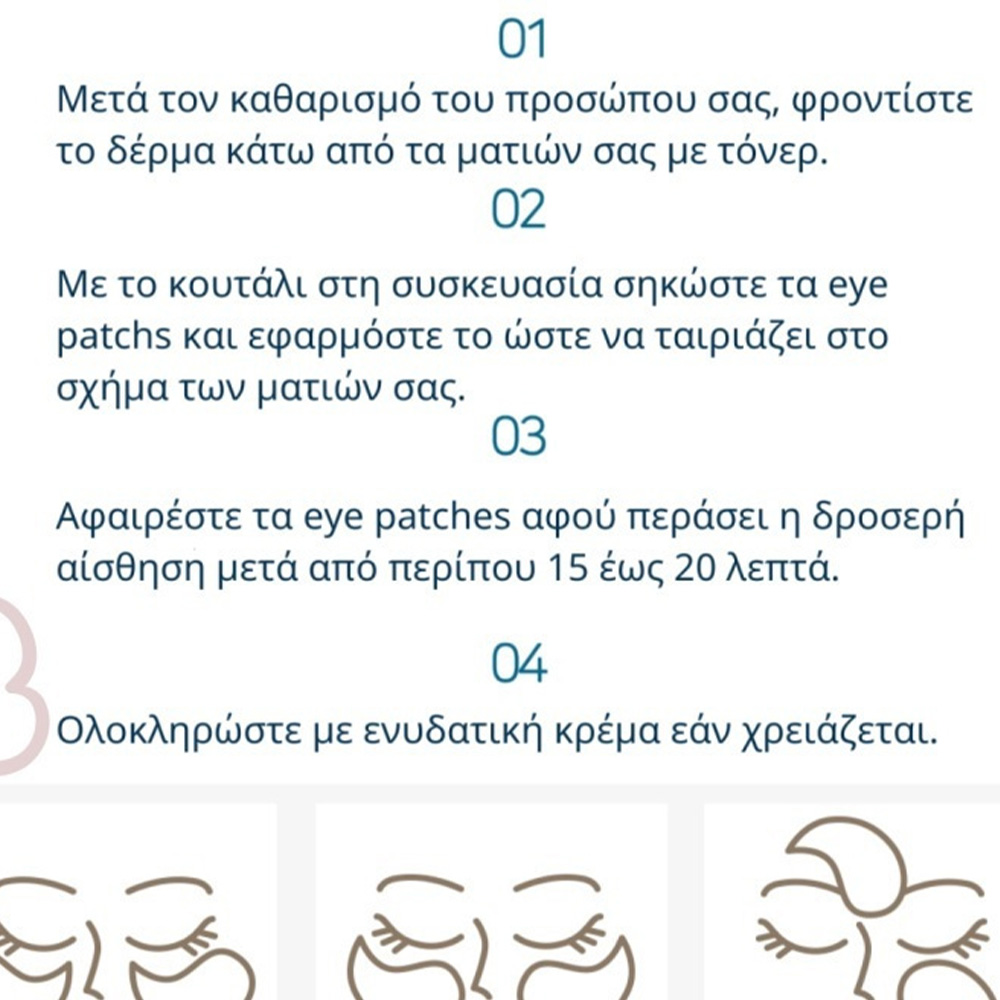 Καθαρίστε και στεγνώστε την περιοχή γύρω από τα μάτια. Εφαρμόστε τα επιθέματα και αφήστε τα να δράσουν για 20-30 λεπτά. Αφαιρέστε τα και απλώστε απαλά το υπόλοιπο προϊόν μέχρι να απορροφηθεί.