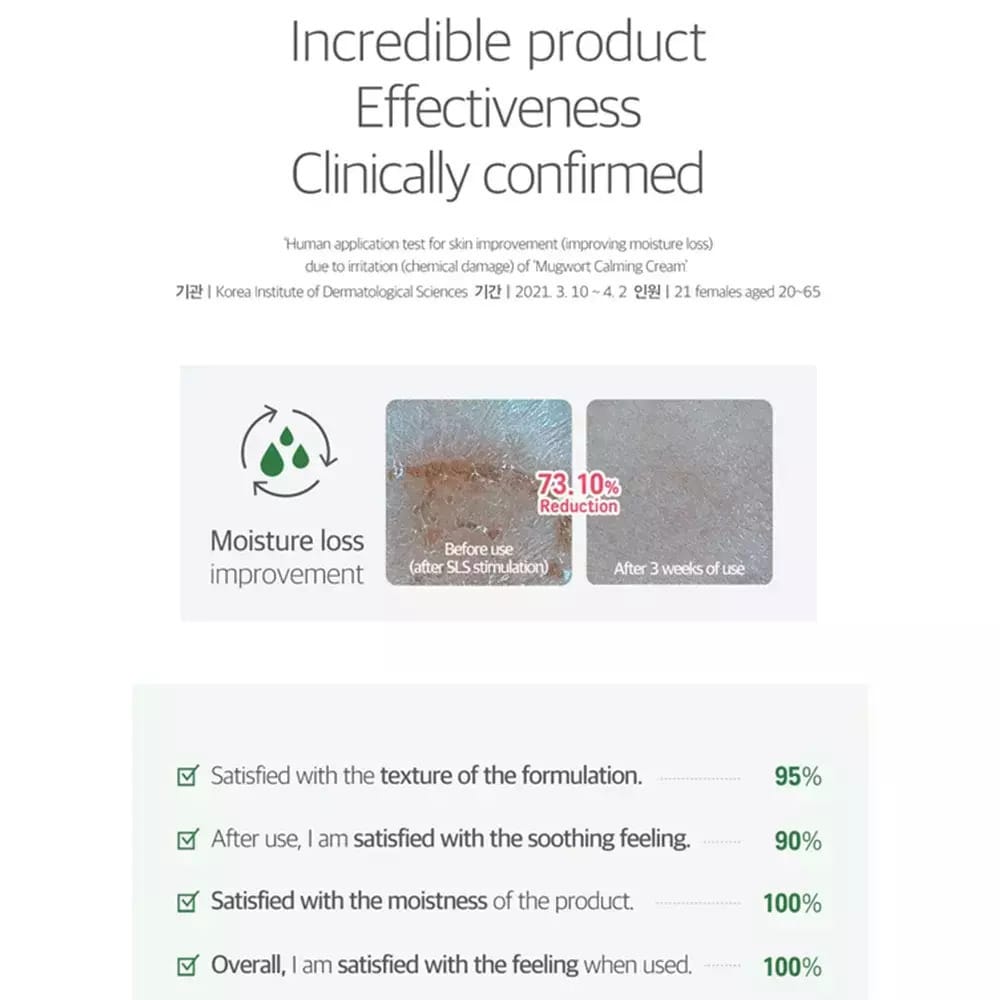 Η Mugwort Calming Cream είναι ιδανική επιλογή για όσους αναζητούν ηρεμία, ενυδάτωση και προστασία σε ένα προϊόν. Συνδυάζει την παράδοση των βοτάνων με την τεχνολογία της κορεάτικης ομορφιάς, προσφέροντας μια ολοκληρωμένη εμπειρία φροντίδας.