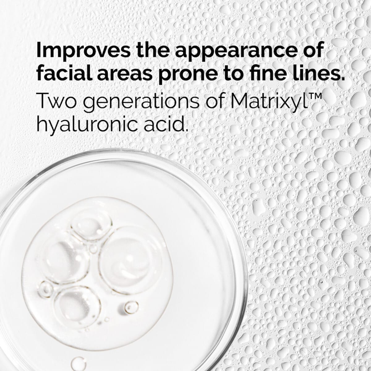 Τα πεπτίδια Matrixyl™ συμβάλλουν στη βελτίωση της εμφάνισης της επιδερμίδας, ενώ το υαλουρονικό οξύ βοηθά στη διατήρηση της υγρασίας, αφήνοντας το δέρμα πιο απαλό και ενυδατωμένο.